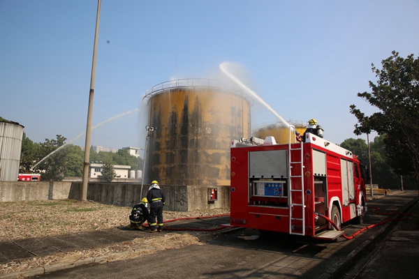 本次演練為貼近實戰(zhàn)的綜合實戰(zhàn)演練,以該公司油庫區(qū)2號罐發(fā)生火情為背景,分為演練準(zhǔn)備、發(fā)現(xiàn)火情和火災(zāi)撲救三個演練階段。演練當(dāng)日上午10時40分,消防隊接到燃運部報警油庫區(qū)2號油罐因外部居民燃放焰火原因?qū)е缕鸹?,出動?輛消防車和兩個戰(zhàn)斗班,立即趕赴現(xiàn)場進(jìn)行救援。到達(dá)現(xiàn)場經(jīng)火情偵查后,消防隊指揮員迅速做出部署,一輛泡沫消防車對2號油罐北面進(jìn)行滅火、阻火作業(yè),一輛水罐車對2號油罐南面以及燃燒處噴射滅火,并掩護(hù)人員撤離。經(jīng)過齊心協(xié)力的奮戰(zhàn),火情被成功撲滅,演練取得圓滿成功。