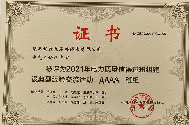 中國電力網(wǎng)訊 10月11日至10月15日, 2021年電力行業(yè)質(zhì)量信得過班組建設(shè)交流發(fā)布會(huì)在合肥召開,陜投集團(tuán)趙石畔煤電設(shè)備部電氣自動(dòng)化中心被評(píng)為“電力質(zhì)量AAAA級(jí)質(zhì)量信得過班組”。