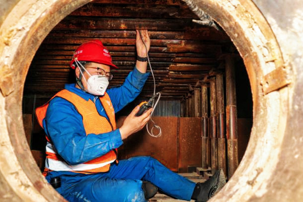 圖為檢修人員測量鍋爐一級再熱管管壁厚度