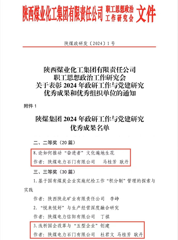 中國(guó)電力網(wǎng)訊 (通訊員:馬桂芳)10月30日,陜煤集團(tuán)思想政治工作研究會(huì)發(fā)布了《關(guān)于表彰2024年政研工作與黨建研究?jī)?yōu)秀成果和優(yōu)秀組織單位的通知》,陜煤石門發(fā)電公司2項(xiàng)政研課題獲表彰。其中,《論如何推動(dòng)“奮進(jìn)者”文化遍地生花》獲評(píng)集團(tuán)公司優(yōu)秀成果二等獎(jiǎng),《淺析國(guó)企改革與“五型企業(yè)”創(chuàng)建》獲評(píng)集團(tuán)公司優(yōu)秀成果三等獎(jiǎng)。