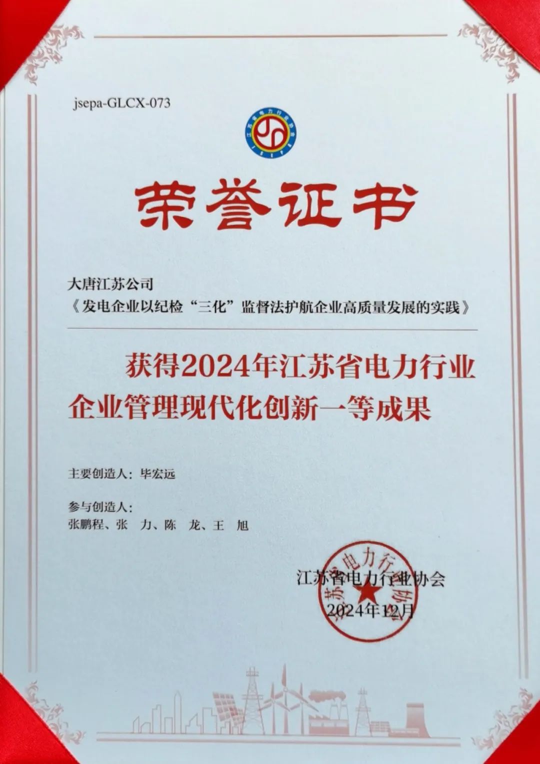 近期,江蘇公司紀(jì)委申報(bào)題為《發(fā)電企業(yè)以紀(jì)檢“三化”監(jiān)督法護(hù)航企業(yè)高質(zhì)量發(fā)展的實(shí)踐》案例榮獲2024年江蘇省電力行業(yè)企業(yè)管理現(xiàn)代化創(chuàng)新“一等成果”。