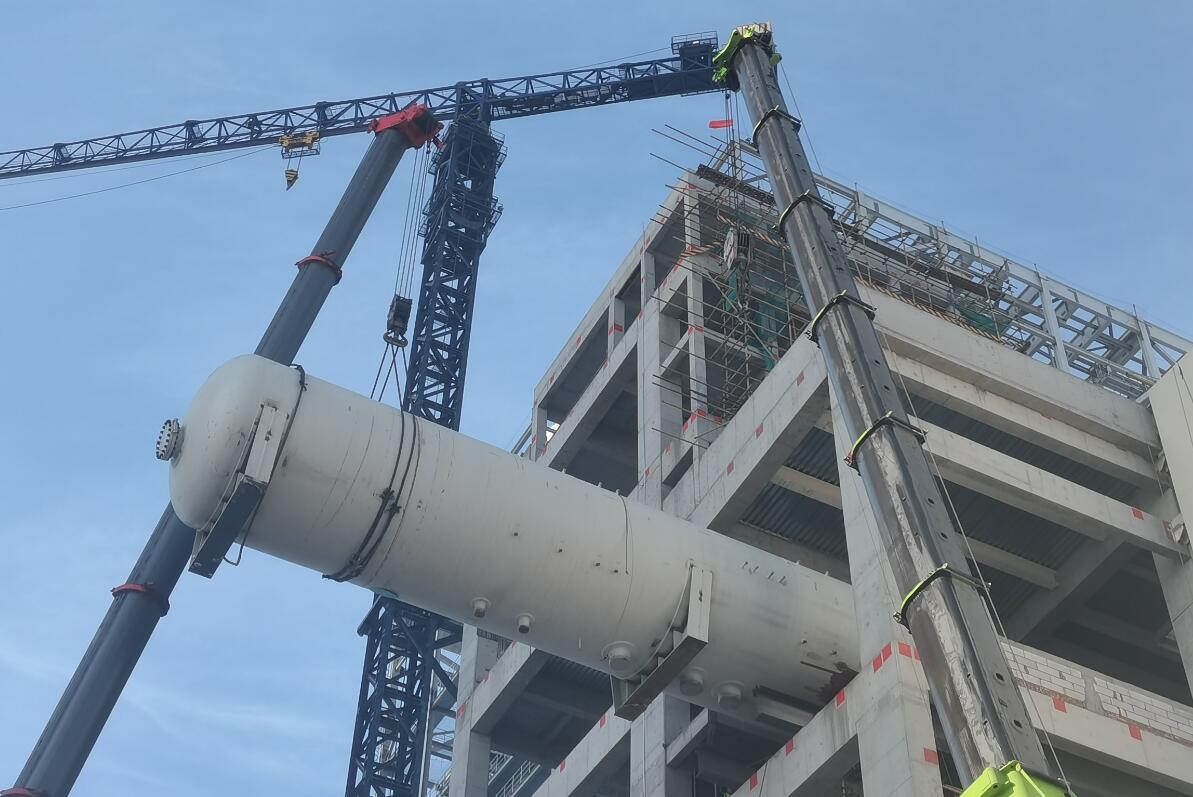 項(xiàng)目部地處北疆,氣候惡劣,最低氣溫逼近零下30攝氏度,7級(jí)以上大風(fēng)天氣屢見不鮮,整體吊裝施工技術(shù)難度大。為確保吊裝作業(yè)安全高效完成,項(xiàng)目縝密策劃、精心組織,組織多次進(jìn)行技術(shù)交底,編寫專項(xiàng)施工方案,確認(rèn)現(xiàn)場(chǎng)作業(yè)條件,對(duì)作業(yè)人員資質(zhì)、吊裝設(shè)備、吊索具以及安全機(jī)構(gòu)穩(wěn)定等方面進(jìn)行了仔細(xì)的檢查與確認(rèn)。項(xiàng)目領(lǐng)導(dǎo)堅(jiān)守一線,各部門協(xié)同共進(jìn),默契配合,起鉤,設(shè)備轉(zhuǎn)向,接觸軌道,200噸汽車吊送入、脫鉤,500噸汽車吊送入,整體進(jìn)入軌道,電動(dòng)葫蘆拖動(dòng)就位,整個(gè)過(guò)程一氣呵成,當(dāng)日18點(diǎn)18分除氧器順利就位。