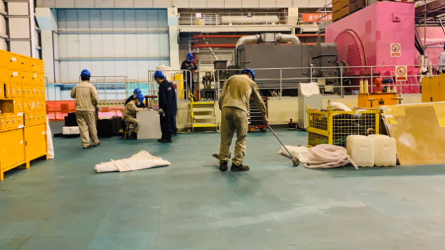 在大修尾聲,我又看到了一個(gè)背影。他正背對(duì)著我,一絲不茍地清潔著剛剛“撤場(chǎng)”完畢后的地面,發(fā)揮著工完料盡場(chǎng)地清的傳統(tǒng)“藝能”——他的衣服已經(jīng)汗透,緊緊地貼在背上,我看不見他的臉,卻依然尊敬地對(duì)著他,舉起了相機(jī)。