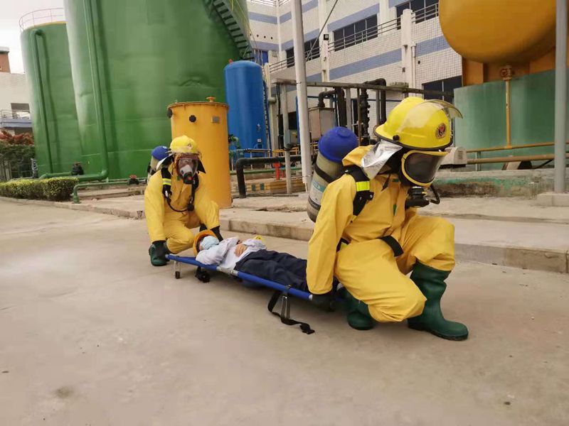 本次應(yīng)急演練模擬的是:化學(xué)區(qū)域卸酸作業(yè)過程中,突發(fā)卸酸軟管泄漏,酸罐車司機(jī)因撤離不及時,吸入少量酸氣,暈倒在酸罐區(qū)域;值長接到匯報后立即組織人員進(jìn)行搶救并處理泄漏酸液。當(dāng)班值長迅速聯(lián)系醫(yī)院和搶險組請求支援,隨后消防隊員穿防護(hù)服入場,開啟噴淋設(shè)施,將昏迷人員移至安全區(qū)域,由電氣人員進(jìn)行搶救,隨后消防人員用清水對地面殘留酸液進(jìn)行稀釋。