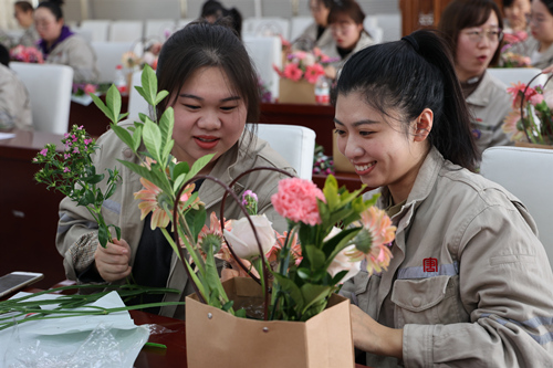 在公司“妙手生花 璽印芳華”慶“三八”創(chuàng)意插花活動(dòng)現(xiàn)場(chǎng),大家正興趣盎然、興高采烈的精心制作插花作品,不時(shí)傳來(lái)陣陣歡聲笑語(yǔ)。