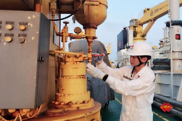 圖為疏浚船舶人員正在進(jìn)行設(shè)備維護(hù)