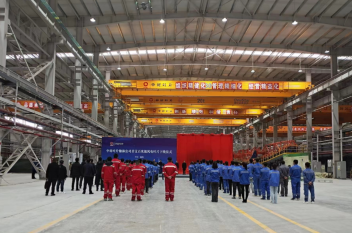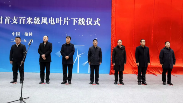 縣委書記姬世平宣布中材葉片榆林公司首支百米級風(fēng)電葉片順利下線。