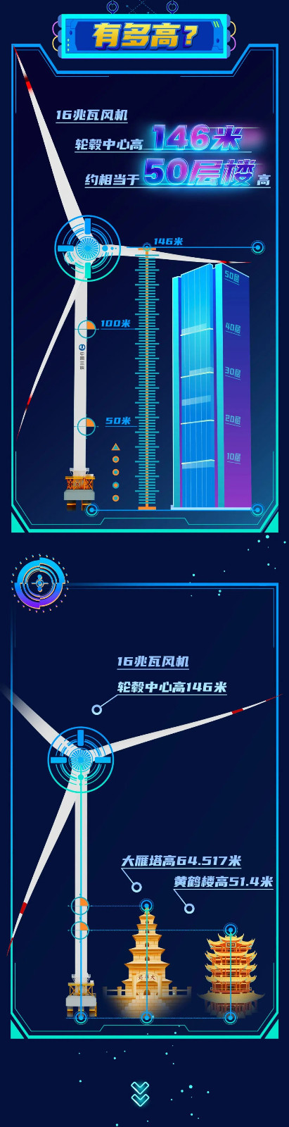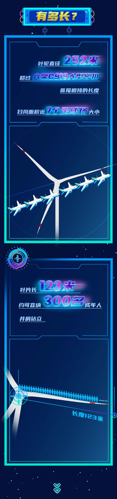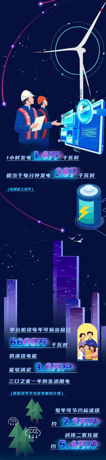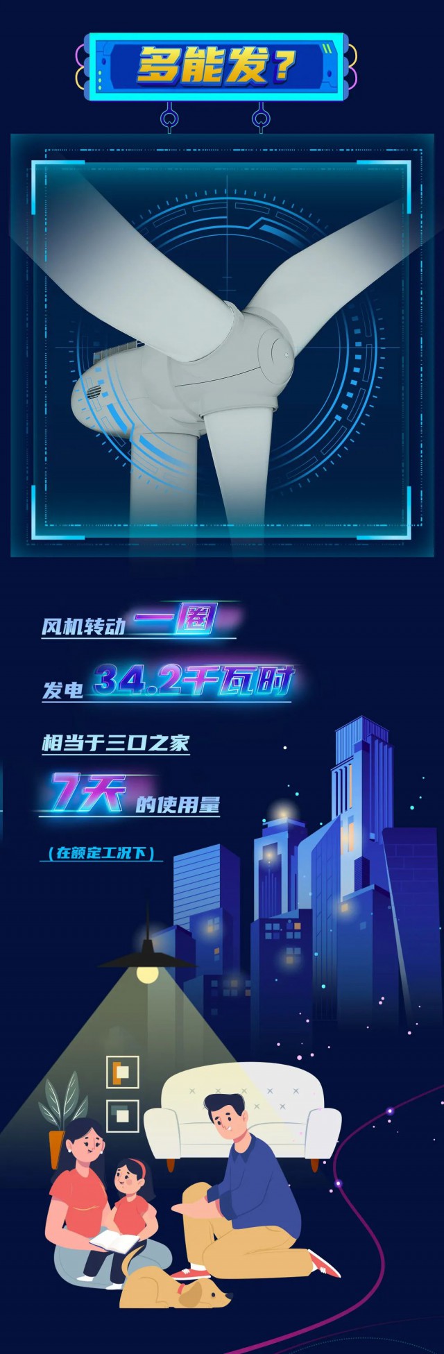 此次下線的單機(jī)容量16兆瓦海上風(fēng)電機(jī)組,葉輪直徑252米,葉輪掃風(fēng)面積約5萬平方米,約相當(dāng)于7個(gè)標(biāo)準(zhǔn)足球場大;輪轂高度達(dá)146米,約相當(dāng)于一座50層大樓的高度。在額定工況下,單臺機(jī)組每轉(zhuǎn)動(dòng)一圈可發(fā)電34.2千瓦時(shí)。根據(jù)多年平均發(fā)電量設(shè)計(jì)值,單臺機(jī)組每年可輸出超過6600萬千瓦時(shí)的清潔電能,能夠滿足3.6萬戶三口之家一年的生活用電,可節(jié)約標(biāo)煤約2.2萬噸,減排二氧化碳約5.4萬噸。