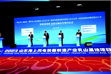 活動現(xiàn)場,乳山與國家電力投資集團(tuán)山東分公司、國家能源集團(tuán)投資山東分公司、明陽智慧能源集團(tuán)股份公司等8家企業(yè)現(xiàn)場簽署合作協(xié)議,同時,啟動了國華科技創(chuàng)新中心建設(shè)。