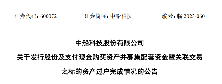 公告披露,截至本公告日,中船科技發(fā)行股份及支付現(xiàn)金購(gòu)買資產(chǎn)并募集配套資金暨關(guān)聯(lián)交易之標(biāo)的資產(chǎn)交割及過(guò)戶手續(xù)已辦理完畢。