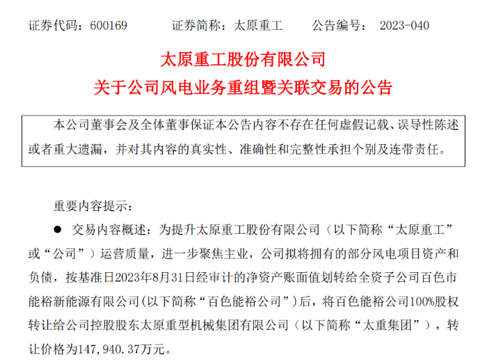 公告披露,太原重工擬將擁有的部分風電項目資產(chǎn)和負債,按基準日2023年8月31日經(jīng)審計的凈資產(chǎn)賬面值劃轉(zhuǎn)給全資子公司百色市能裕新能源有限公司(以下簡稱“百色能裕公司”)后,將百色能裕公司100%股權轉(zhuǎn)讓給公司控股股東太原重型機械集團有限公司(以下簡稱“太重集團”),轉(zhuǎn)讓價格為147,940.37萬元。