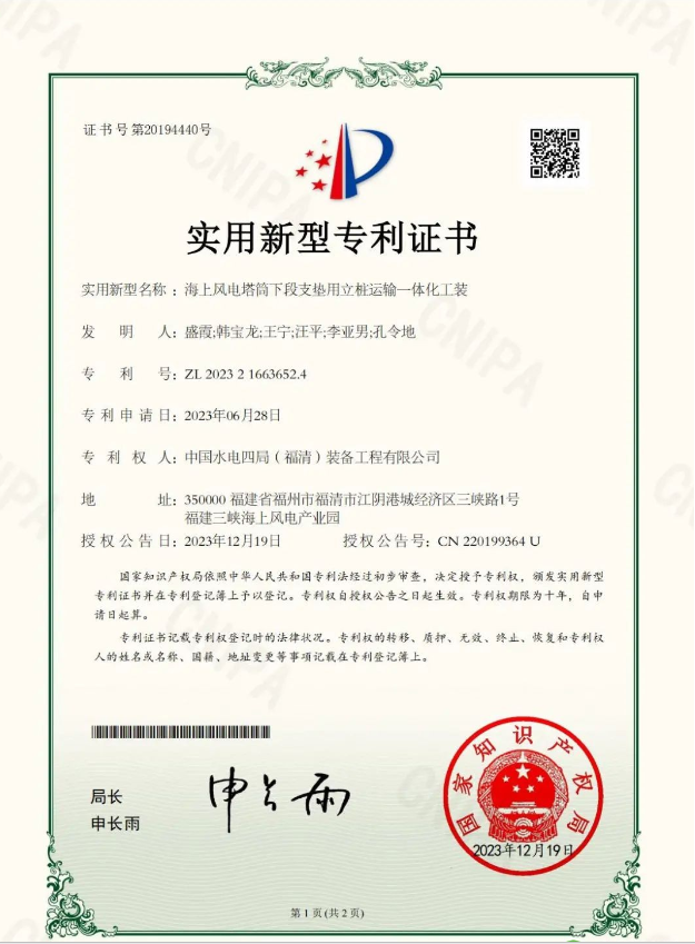 近日,由中國水電四局福清公司申報的實用新型專利《海上風(fēng)電塔筒下段支墊用立樁運(yùn)輸一體化工裝》順利通過國家知識產(chǎn)權(quán)局審查并獲得授權(quán)。截至目前,福清公司共獲得實用新型專利授權(quán)25項。