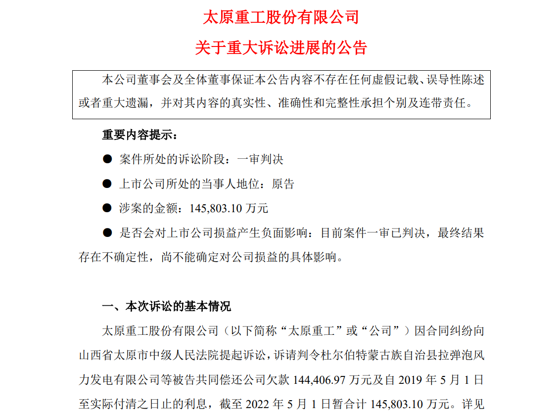 公告披露,太原重工因合同糾紛向山西省太原市中級(jí)人民法院提起訴訟,訴請(qǐng)判令杜爾伯特蒙古族自治縣拉彈泡風(fēng)力發(fā)電有限公司(以下簡(jiǎn)稱“拉彈泡公司”)等被告共同償還公司欠款144,406.97萬(wàn)元及自2019年5月1日至實(shí)際付清之日止的利息,截至2022年5月1日暫合計(jì)145,803.10萬(wàn)元。