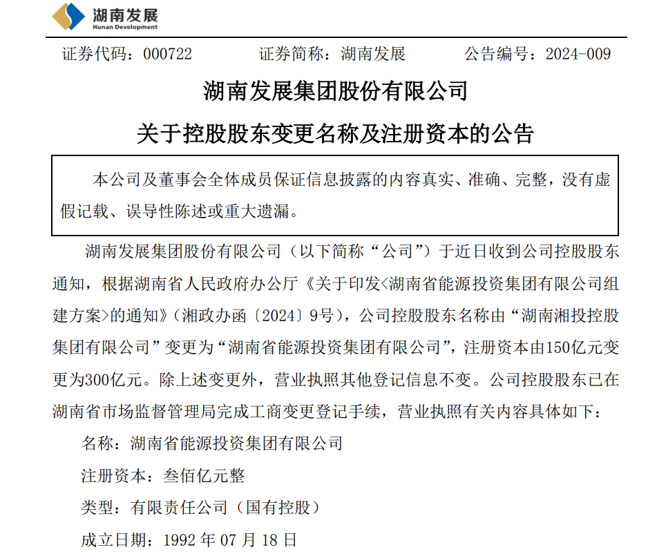 公告顯示,湖南發(fā)展于近日收到公司控股股東通知,根據(jù)湖南省人民政府辦公廳《關(guān)于印發(fā)<湖南省能源投資集團有限公司組建方案>的通知》(湘政辦函〔2024〕9號),公司控股股東名稱由“湖南湘投控股集團有限公司”變更為“湖南省能源投資集團有限公司”,注冊資本由150億元變更為300億元。除上述變更外,營業(yè)執(zhí)照其他登記信息不變。公司控股股東已在湖南省市場監(jiān)督管理局完成工商變更登記手續(xù)。