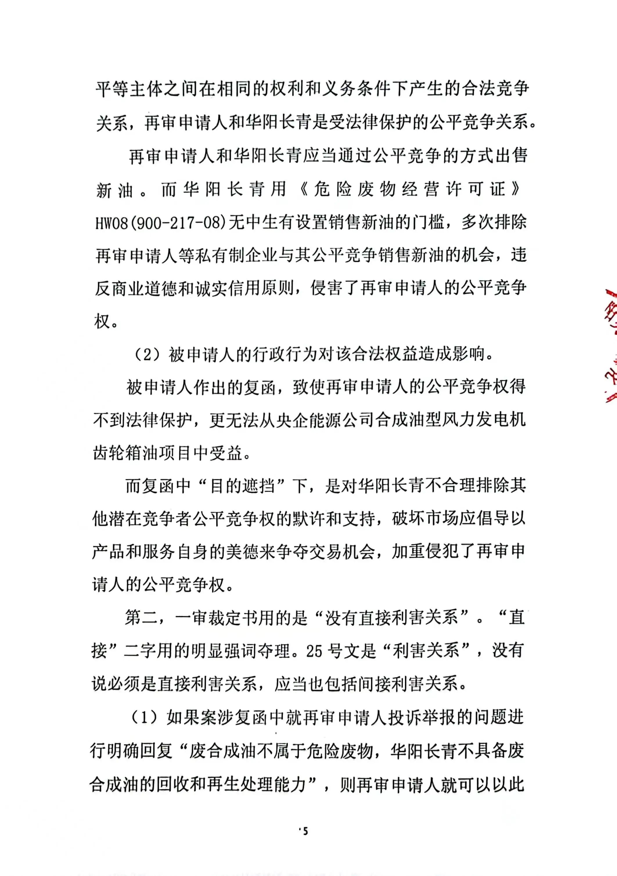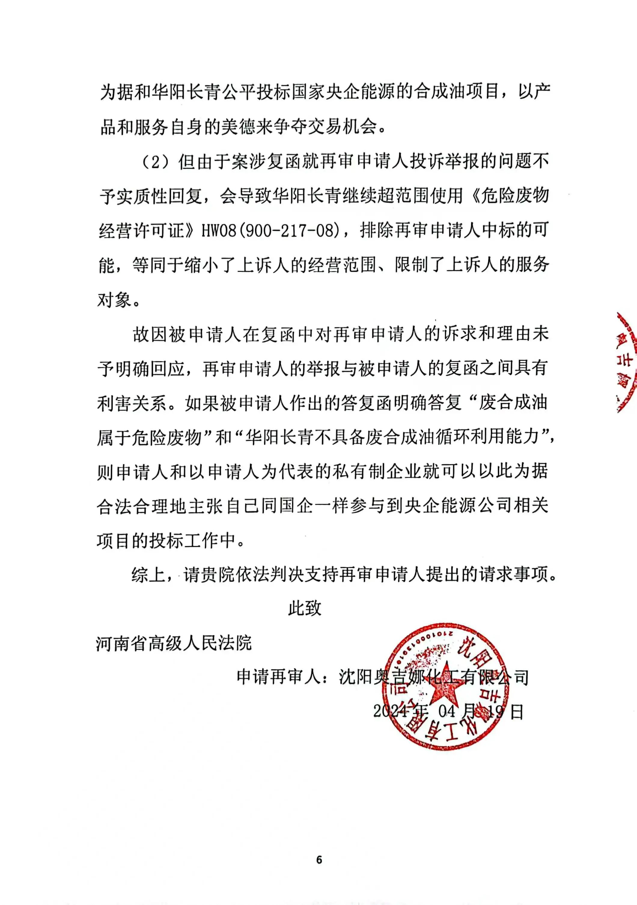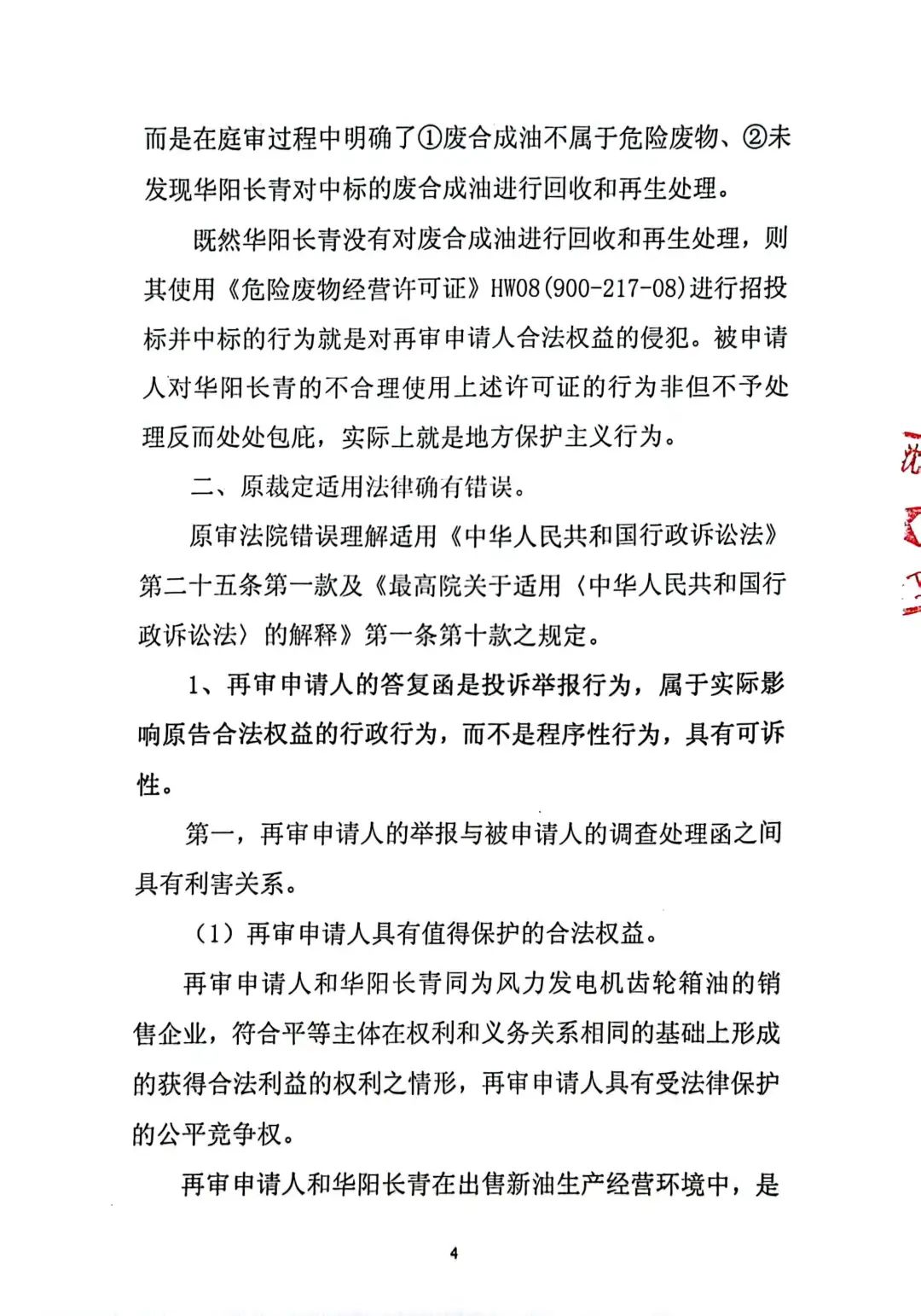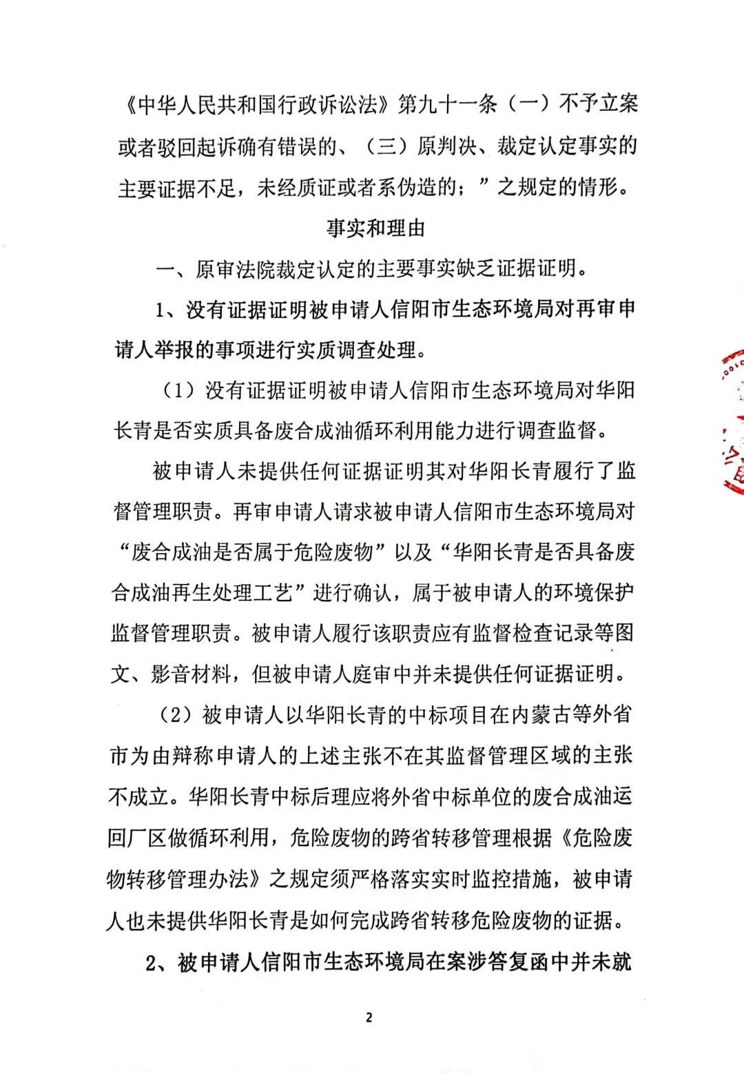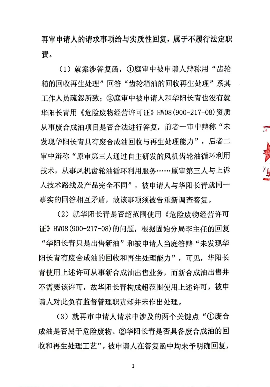 奧吉娜公司在再審申請(qǐng)中再次要求對(duì)兩個(gè)關(guān)鍵問(wèn)題進(jìn)行法庭調(diào)查:1、《調(diào)查處理函》中的回答是錯(cuò)誤的。信陽(yáng)市生態(tài)環(huán)境局依據(jù)《國(guó)家危險(xiǎn)廢物名錄(2021版)》認(rèn)定廢合成油不屬于危險(xiǎn)廢物,不需要《危險(xiǎn)廢物許可證》這種回答是錯(cuò)誤的,而且作為一個(gè)市級(jí)行政職能部門信陽(yáng)市生態(tài)環(huán)境局也無(wú)權(quán)作出這種認(rèn)定。2、根據(jù)奧吉娜公司對(duì)目前廢合成型風(fēng)電潤(rùn)滑油再生技術(shù)的了解,華陽(yáng)長(zhǎng)青公司不具備廢合成型風(fēng)電潤(rùn)滑油的再生能力,所謂的再生處理存在造假和欺騙的嫌疑!