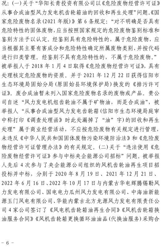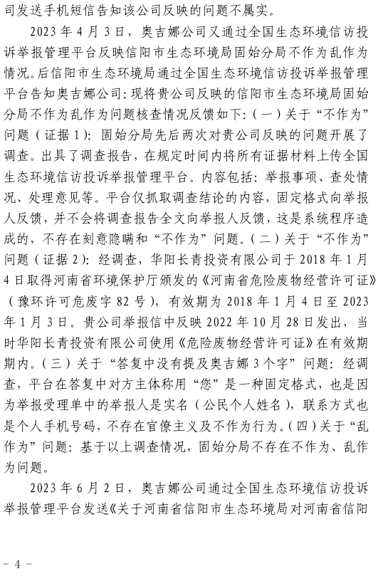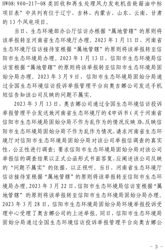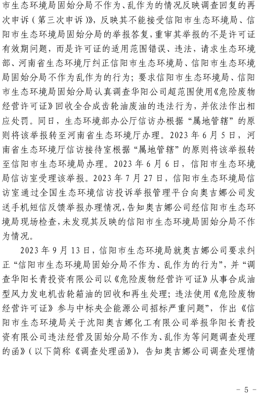 2023年3月9日,奧吉娜公司收到固始分局通過(guò)12369環(huán)境信訪平臺(tái)的短信答復(fù):“反映問(wèn)題不屬實(shí)”。3月10日,奧吉娜公司向固始分局負(fù)責(zé)人電話詢問(wèn),其解釋稱:經(jīng)調(diào)查核實(shí),華陽(yáng)長(zhǎng)青公司沒(méi)有再生風(fēng)電潤(rùn)滑油銷售,出售的是新油。否定了奧吉娜公司的舉報(bào)內(nèi)容。對(duì)此,奧吉娜公司表示強(qiáng)烈不滿。3月11日,奧吉娜公司向環(huán)境部投訴固始分局的不作為和亂作為。2023年5月26日,奧吉娜公司收到12369環(huán)境信訪平臺(tái)的短信答復(fù)。答復(fù)部門為信陽(yáng)環(huán)境局。令人啼笑皆非的是,答復(fù)稱,華陽(yáng)長(zhǎng)青的許可證有效期沒(méi)有問(wèn)題,與舉報(bào)內(nèi)容風(fēng)馬牛不相及。2023年6月13日,奧吉娜公司再次向環(huán)境部提出申訴,指出,奧吉娜舉報(bào)的不是許可證有效期問(wèn)題,而是許可證的適用范圍錯(cuò)誤、違法。2023年7月27日,奧吉娜公司收到回復(fù)稱,經(jīng)信陽(yáng)市生態(tài)環(huán)境局現(xiàn)場(chǎng)檢查,未發(fā)現(xiàn)固始分局不作為情況。2023年8月3日,奧吉娜公司向河南省生態(tài)環(huán)境廳(以下稱:環(huán)境廳)舉報(bào)信陽(yáng)環(huán)境局包庇固始分局的行為。環(huán)境廳對(duì)此高度重視,有關(guān)處長(zhǎng)和奧吉娜公司負(fù)責(zé)人進(jìn)行了面談。2023年9月13日,信陽(yáng)環(huán)境局向奧吉娜公司致《信陽(yáng)市生態(tài)環(huán)境局關(guān)于沈陽(yáng)奧吉娜化工有限公司舉報(bào)華陽(yáng)長(zhǎng)青投資有限公司違法經(jīng)營(yíng)及固始分局不作為、亂作為等問(wèn)題調(diào)查處理的函》。函中:一是,以“齒輪箱”替換“齒輪箱油”,偷換概念;二是,做出了廢風(fēng)電合成(齒輪)油不屬于危險(xiǎn)廢物的結(jié)論;三是,未發(fā)現(xiàn)固始分局存在不作為、亂作為的不當(dāng)行為。再次否定奧吉娜公司的舉報(bào)和投訴。