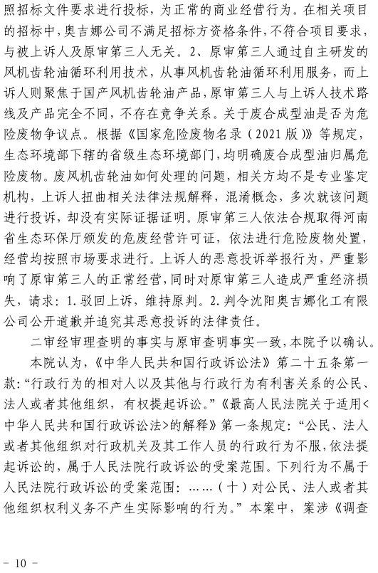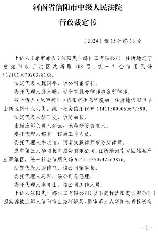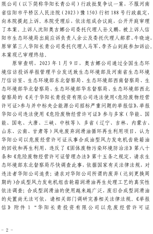 中國(guó)電力網(wǎng)訊 中國(guó)風(fēng)電潤(rùn)滑油龍頭企業(yè)沈陽(yáng)奧吉娜化工有限公司(下簡(jiǎn)稱:奧吉娜公司或上訴人)訴信陽(yáng)市生態(tài)環(huán)境局(被上訴人)和第三人華陽(yáng)長(zhǎng)青投資有限公司(下簡(jiǎn)稱:華陽(yáng)長(zhǎng)青公司)行政訴訟案,河南省信陽(yáng)市中級(jí)人民法院于2024年4月2日作出二審行政裁定:駁回上訴,維護(hù)原裁定。