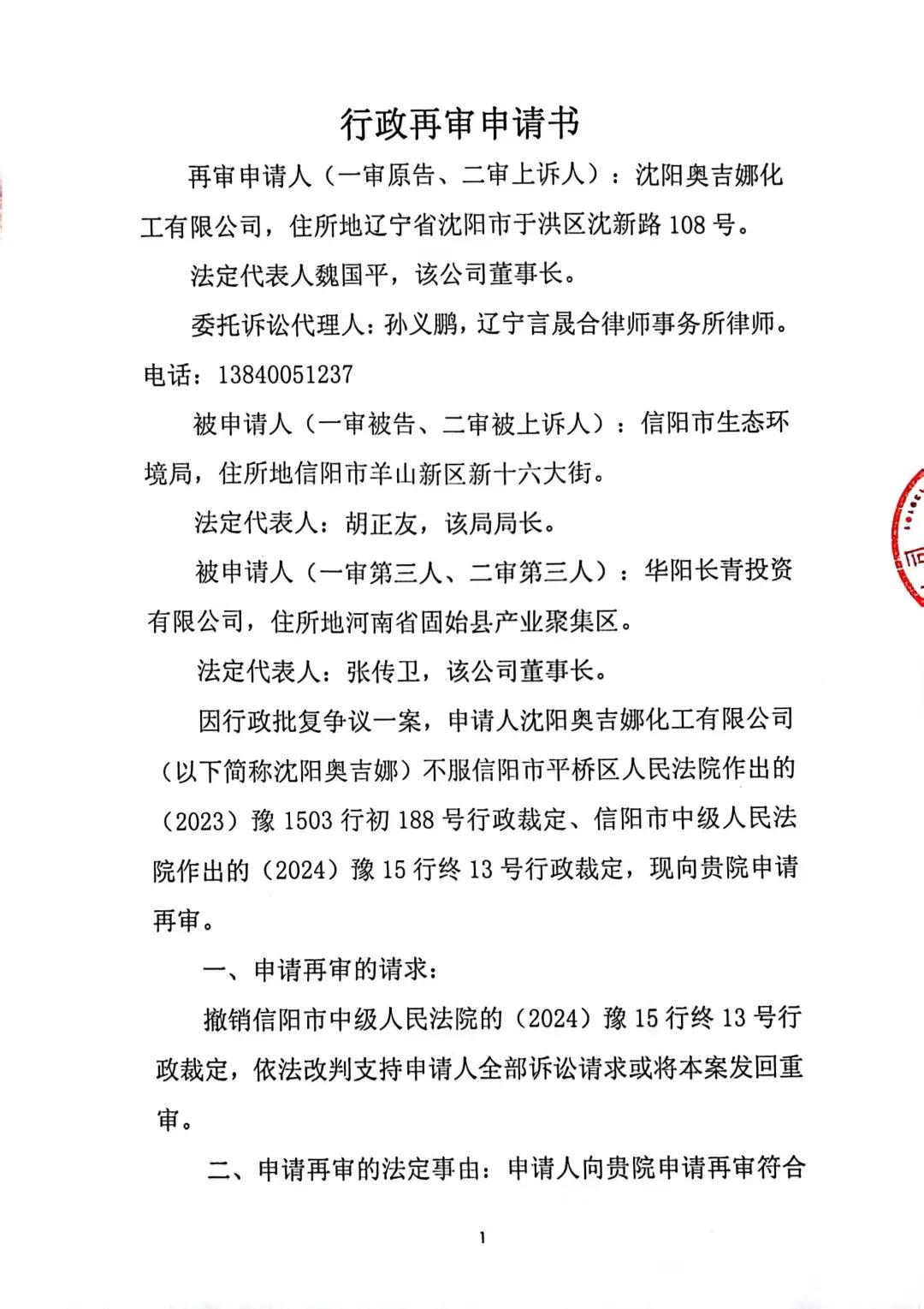 1、原告:沈陽(yáng)奧吉娜化工有限公司,被告:信陽(yáng)市環(huán)境局,第三人:華陽(yáng)長(zhǎng)青投資有限公司。
