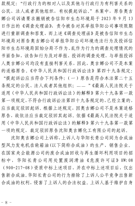 2、一審訴訟請(qǐng)求:請(qǐng)求人民法院判決撤銷被告作出的《信陽(yáng)市生態(tài)環(huán)境局關(guān)于沈陽(yáng)奧吉娜化工有限公司舉報(bào)華陽(yáng)長(zhǎng)青投資有限公司違法經(jīng)營(yíng)及固始分局不作為、亂作為等問(wèn)題調(diào)查處理的函》;責(zé)令被告對(duì)原告向被告舉報(bào)華陽(yáng)長(zhǎng)青投資有限公司事項(xiàng),限期進(jìn)行重新調(diào)查和答復(fù);判令被告認(rèn)定的廢合成油不應(yīng)按危險(xiǎn)廢物有關(guān)規(guī)定進(jìn)行管理違反法律規(guī)章規(guī)定,無(wú)效。