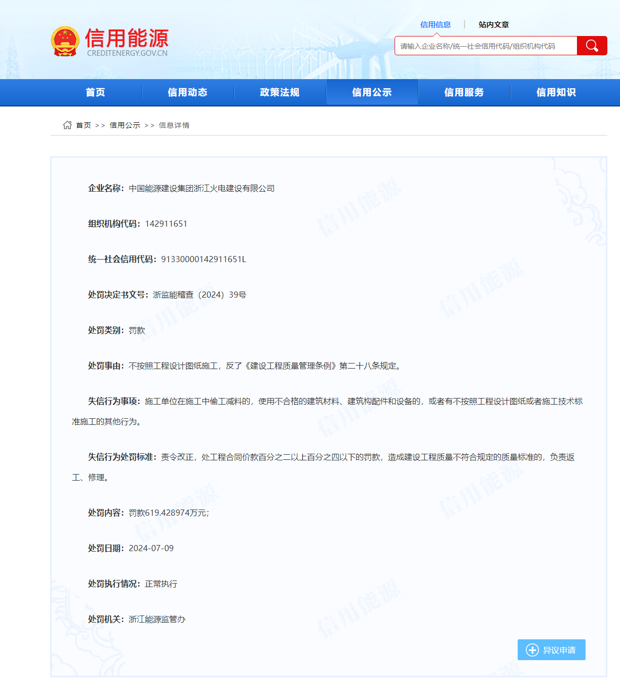 浙江能源監(jiān)管辦發(fā)布的《行政處罰決定書(shū)》(浙監(jiān)能稽查〔2024〕39號(hào))中依據(jù)《建設(shè)工程質(zhì)量管理?xiàng)l例》(下稱(chēng)“條例”)第六十四條對(duì)中國(guó)能建浙江火電處以了619萬(wàn)余元的罰款。條例明確:施工單位在施工中偷工減料的,使用不合格的建筑材料、建筑構(gòu)配件和設(shè)備的,或者有不按照工程設(shè)計(jì)圖紙或者施工技術(shù)標(biāo)準(zhǔn)施工的其他行為的,責(zé)令改正,處工程合同價(jià)款百分之二以上百分之四以下的罰款;造成建設(shè)工程質(zhì)量不符合規(guī)定的質(zhì)量標(biāo)準(zhǔn)的,負(fù)責(zé)返工、修理,并賠償因此造成的損失;情節(jié)嚴(yán)重的,責(zé)令停業(yè)整頓,降低資質(zhì)等級(jí)或者吊銷(xiāo)資質(zhì)證書(shū)。