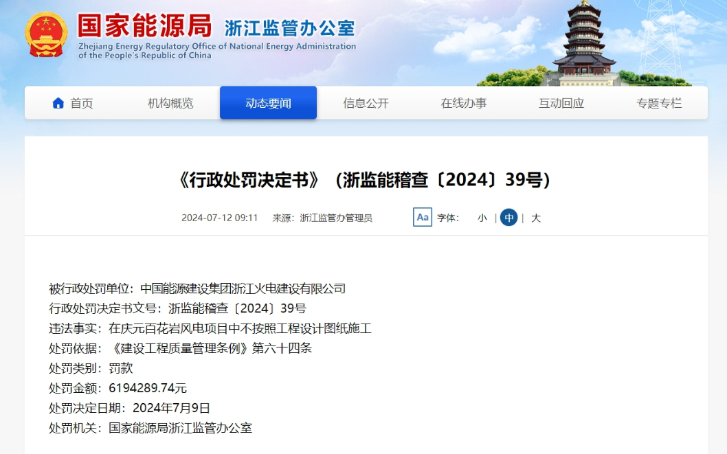 近日,國(guó)家能源局浙江監(jiān)管辦公室發(fā)布的《行政處罰決定書(shū)》(浙監(jiān)能稽查〔2024〕39號(hào))顯示,中國(guó)能源建設(shè)集團(tuán)浙江火電建設(shè)有限公司在慶元百花巖風(fēng)電項(xiàng)目中不按照工程設(shè)計(jì)圖紙施工,被處以619.428974萬(wàn)元罰款。