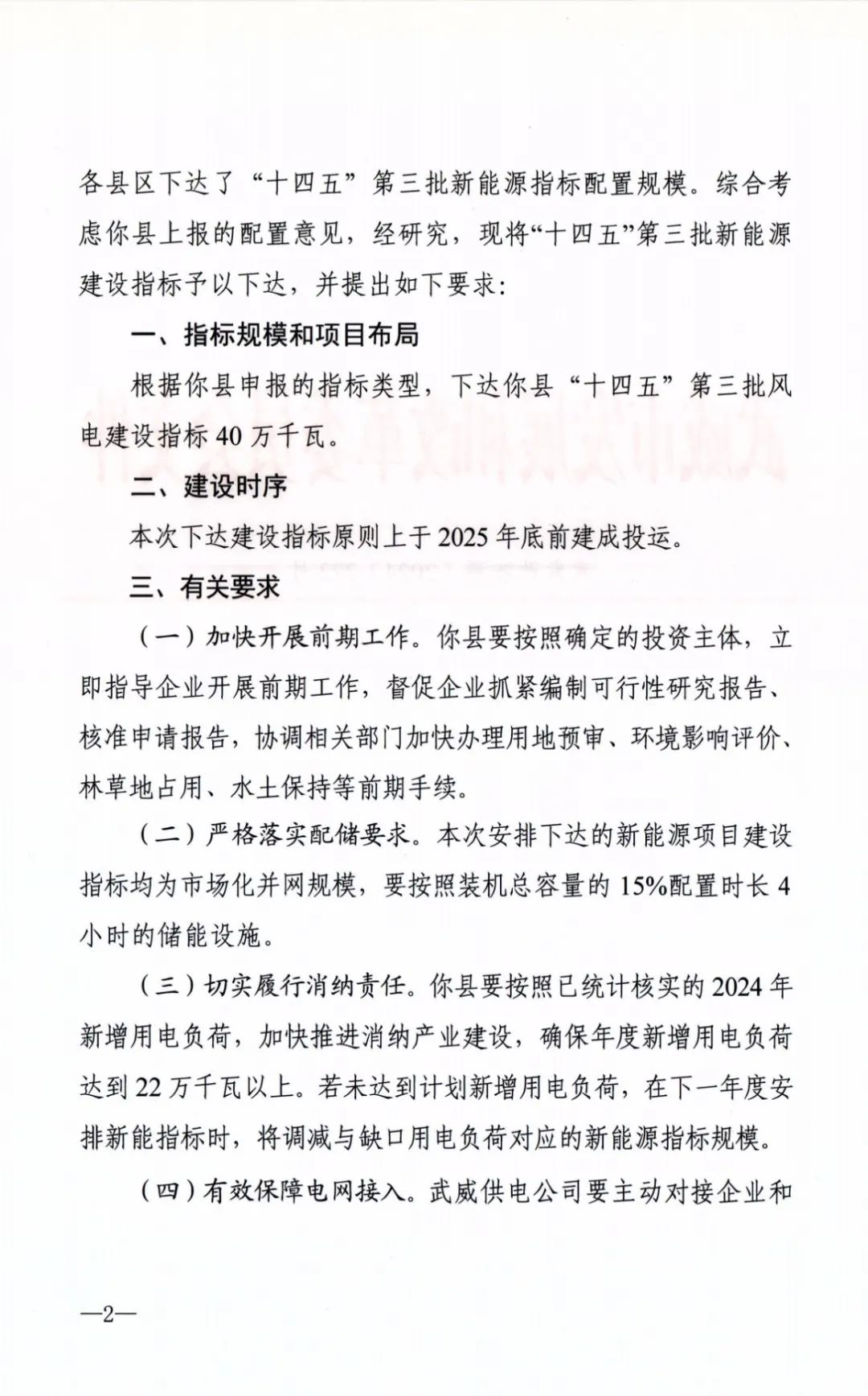 7月30日,甘肅省武威市發(fā)改委發(fā)布《關于下達“十四五”第三批新能源建設指標的通知》。