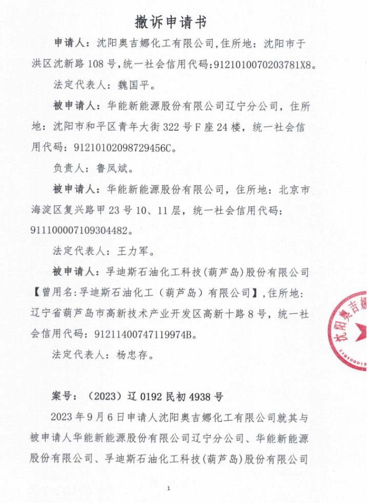 2024年8月13日下午,中國風(fēng)電潤滑油龍頭企業(yè)沈陽奧吉娜化工有限公司(下稱:奧吉娜公司)訴華能新能源股份有限公司遼寧分公司(下稱:華能新能源遼寧分公司或被告一)、華能新能源股份有限公司和孚迪斯石油化工(葫蘆島)有限公司(下稱:被告三)招投標(biāo)串通案(案號:(2023)遼 0192 民初 4938號),定在沈陽高新技術(shù)產(chǎn)業(yè)開發(fā)區(qū)人民法院自由貿(mào)易試驗(yàn)區(qū)人民法庭第三次開庭,開庭前奧吉娜公司遞交了撤訴申請書,法院裁定準(zhǔn)許撤訴。