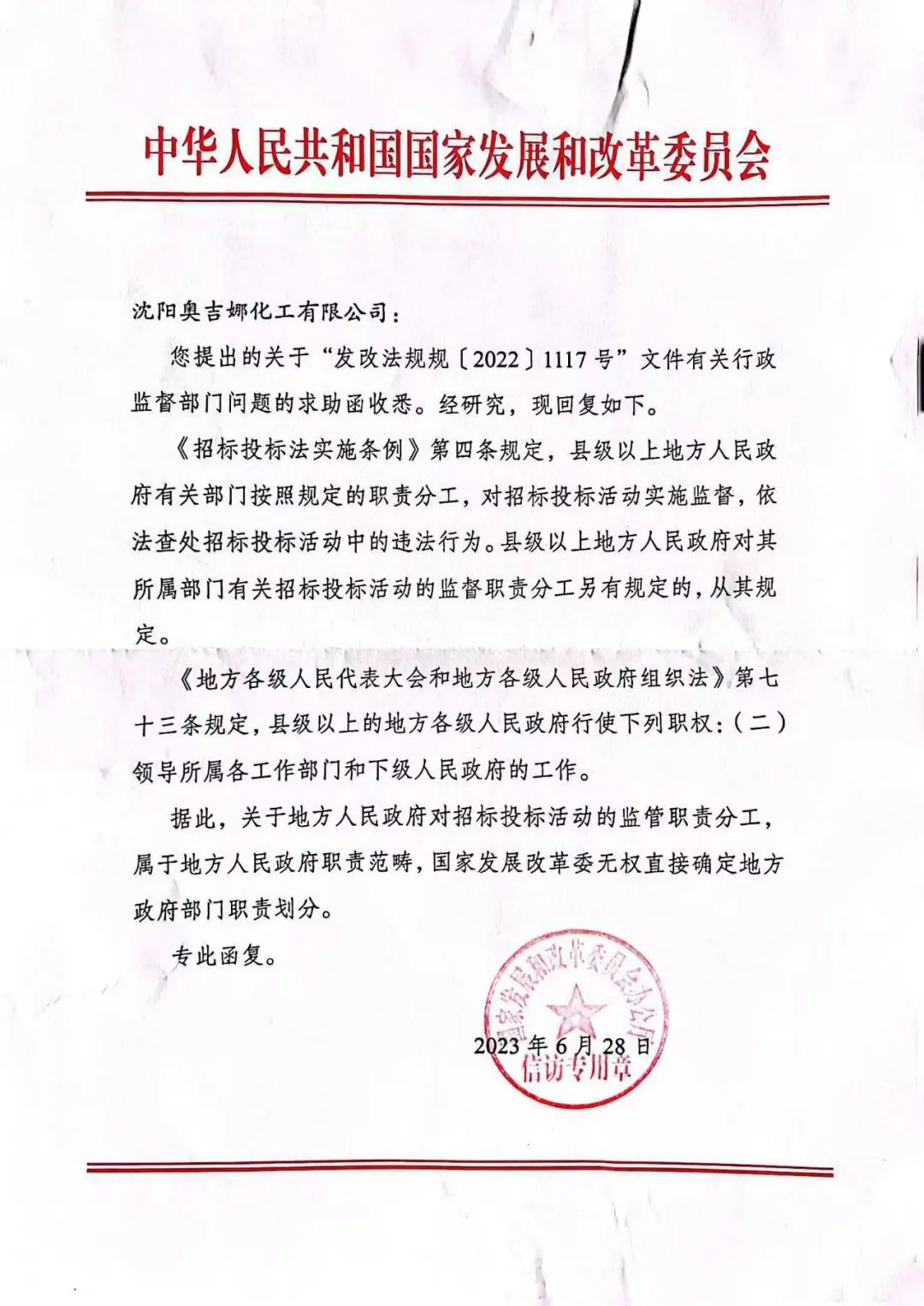 原告曾就被告一和被告三串通投標(biāo)赤裸裸的違法行為多方尋求監(jiān)督部門監(jiān)管,但一直求告無門,無奈向國家發(fā)展和改革委員會投訴,經(jīng)國家發(fā)展和改革委員會回函“地方人民政府對招標(biāo)投標(biāo)活動的監(jiān)管職責(zé)分工,屬于地方人民政府職責(zé)范疇,國家發(fā)展改革委無權(quán)直接確定地方政府部門職責(zé)劃分”(下附國家發(fā)改委回函)。
