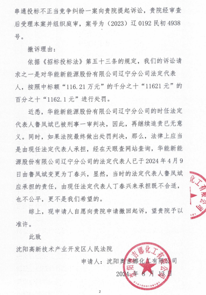 因法定代表人變更,且涉案當(dāng)事人已受到法律制裁,央企風(fēng)電招投標(biāo)招采違法串通申請行政處罰訴訟第一案,沈陽奧吉娜化工有限公司撤訴!
