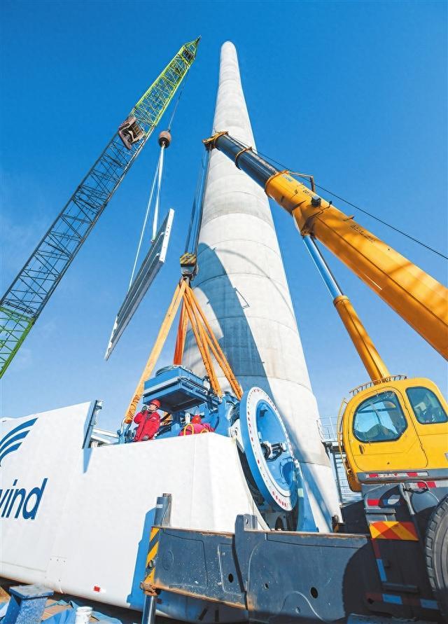 12月18日,在位于新安縣鐵門鎮(zhèn)的雷華風(fēng)電場項(xiàng)目內(nèi),大型機(jī)械正在進(jìn)行風(fēng)機(jī)塔筒吊裝作業(yè)。