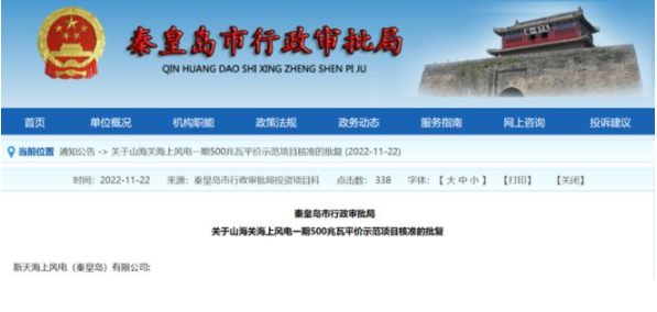 山海關海上風電一期500兆瓦平價示范項目位于山海關區(qū)與遼冀界線海域,北鄰山海關港區(qū),向南輻射至河北省省管海域與國管海域交界附近,東側(cè)為遼冀海域分界線,西側(cè)為秦皇島港東錨地。項目建設單位為新天海上風電(秦皇島)有限公司,風場總?cè)萘繛?00MW,擬設計安裝單機8MW以上風機,配建1座220千伏海上升壓站和1座陸上集控中心。項目估算總投資為62.3865億元。