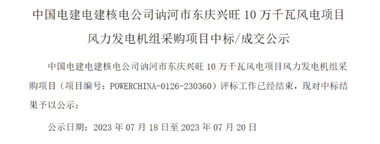 7月18日,中國電建集中采購平臺發(fā)布《中國電建電建核電公司訥河市東慶興旺10萬千瓦風(fēng)電項(xiàng)目風(fēng)力發(fā)電機(jī)組采購項(xiàng)目中標(biāo)/成交公示》的公告。