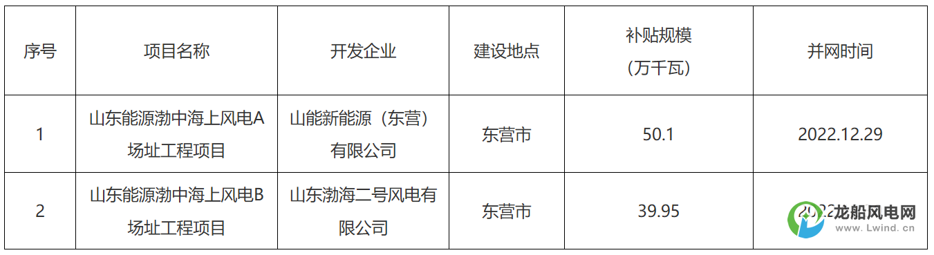 公告顯示,山東省能源局結(jié)合《山東省海上風(fēng)電財(cái)政補(bǔ)貼實(shí)施細(xì)則》有關(guān)規(guī)定,組織專(zhuān)家組對(duì)東營(yíng)市上報(bào)的2022年度建成并網(wǎng)海上風(fēng)電項(xiàng)目財(cái)政補(bǔ)貼申請(qǐng)材料進(jìn)行了復(fù)審。經(jīng)復(fù)審,東營(yíng)市上報(bào)的兩個(gè)海上風(fēng)電項(xiàng)目補(bǔ)貼申請(qǐng)材料符合要求,項(xiàng)目基本信息及補(bǔ)貼規(guī)模公示如下: