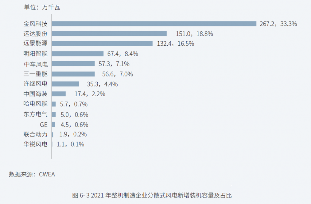 截至2021年年底,整機制造企業(yè)累計共16家,其中,分散式風電累計裝機容量超過50萬千瓦的整機企業(yè)有金風科技、運達股份、遠景能源、明陽智能、三一重能、中車風電,這6家企業(yè)分散式風電累計裝機容量合計為890.8萬千瓦,占分散式風電累計裝機容量的89.4%。