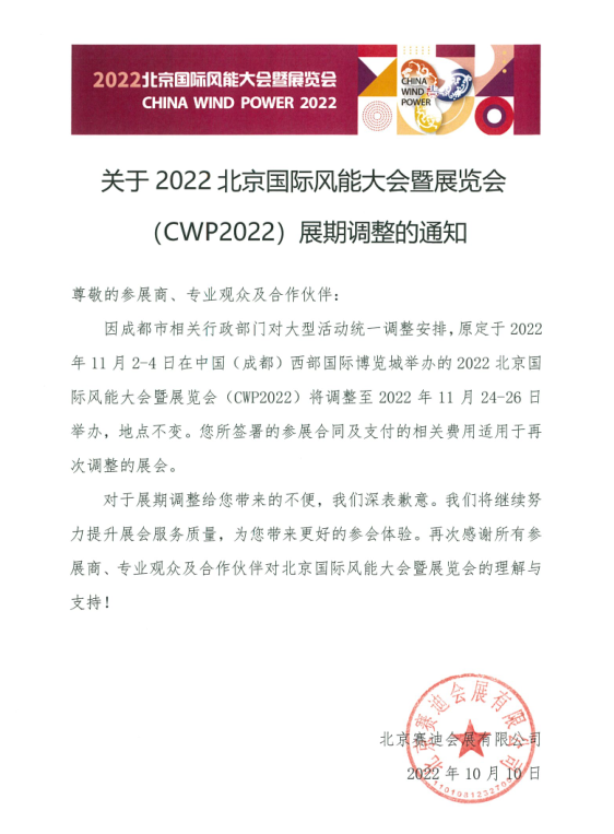 2022北京國(guó)際風(fēng)能大會(huì)暨展覽會(huì)展期調(diào)整
