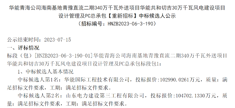 公告顯示,第一中標(biāo)候選人:華能國(guó)際工程技術(shù)有限公司,投標(biāo)報(bào)價(jià):102990.0261萬元。第二中標(biāo)候選人:山東電力建設(shè)第三工程有限公司,投標(biāo)報(bào)價(jià):104702.1330萬元。第三中標(biāo)候選人:中國(guó)電建集團(tuán)山東電力建設(shè)第一工程有限公司,投標(biāo)報(bào)價(jià):109934.0179萬元。