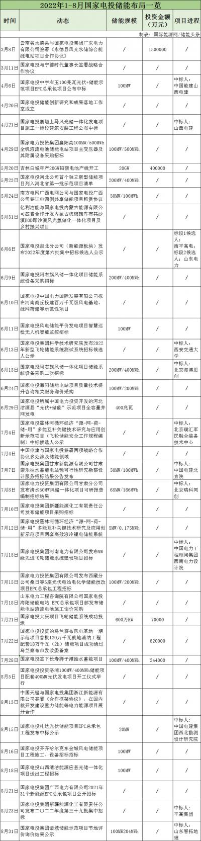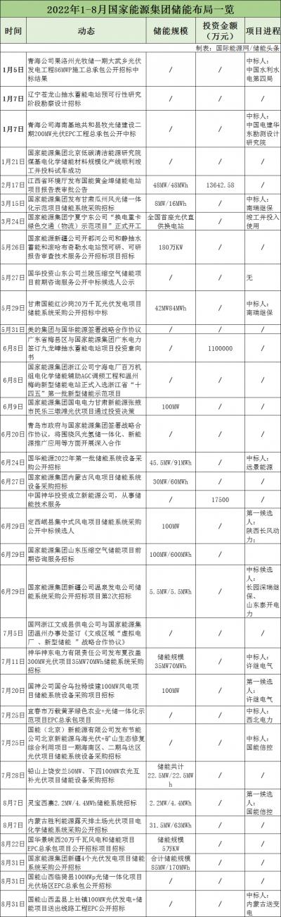 據(jù)不完全統(tǒng)計(jì),2022年1-8月,國家電投與寧德時(shí)代、中國電建、中國天楹等簽訂合作協(xié)議,圍繞儲(chǔ)能材料、風(fēng)光氫儲(chǔ)、重力儲(chǔ)能等方面進(jìn)行合作。儲(chǔ)能項(xiàng)目招標(biāo)26個(gè),涉及飛輪儲(chǔ)能、液流電池、鉛炭電池、抽水蓄能及智慧新能源等方面。