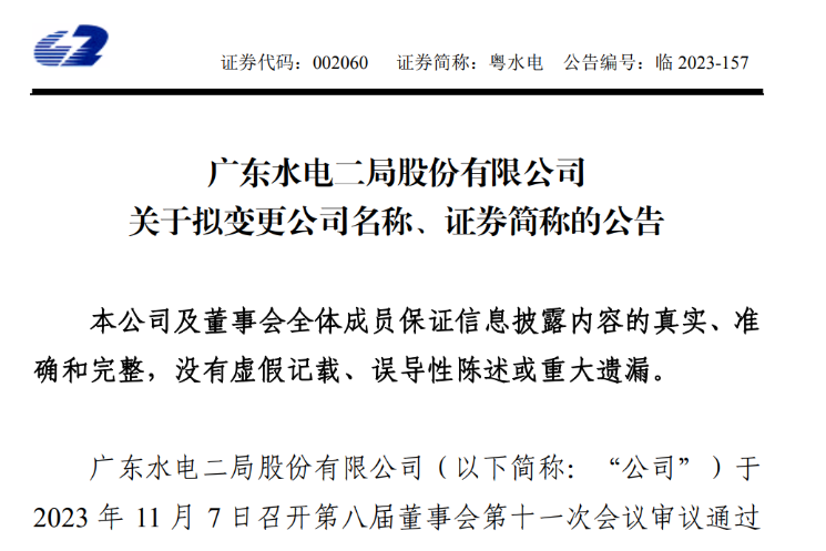公告披露,粵水電于2023年11月7日召開第八屆董事會(huì)第十一次會(huì)議審議通過《關(guān)于擬變更公司名稱、證券簡(jiǎn)稱的議案》,同意公司名稱由“廣東水電二局股份有限公司”變更為“廣東省建筑工程集團(tuán)股份有限公司”、證券簡(jiǎn)稱由“粵水電”變更為“廣東建工”。