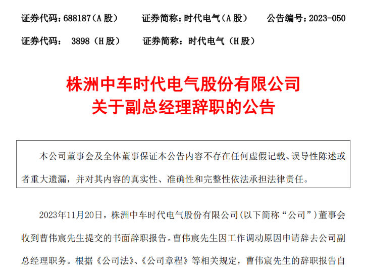 11月21日,株洲中車時代電氣股份有限公司(以下簡稱“時代電氣”或“公司”)發(fā)布《關于副總經(jīng)理辭職的公告》。