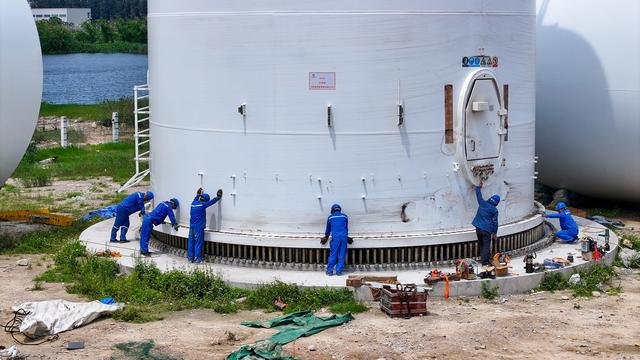 5月15日是全國低碳日。當天,在位于廣東汕頭的全國首個風(fēng)電臨海試驗基地,一個巨型風(fēng)電機組塔筒正在緊鑼密鼓地進行吊裝。據(jù)介紹,該風(fēng)電機組為東方電氣風(fēng)電股份有限公司(以下簡稱“東方電氣”)研制的機型,容量達18兆瓦,是目前全球已經(jīng)開始安裝的最大功率等級海上風(fēng)電機組,將于5月底開展并網(wǎng)測試。