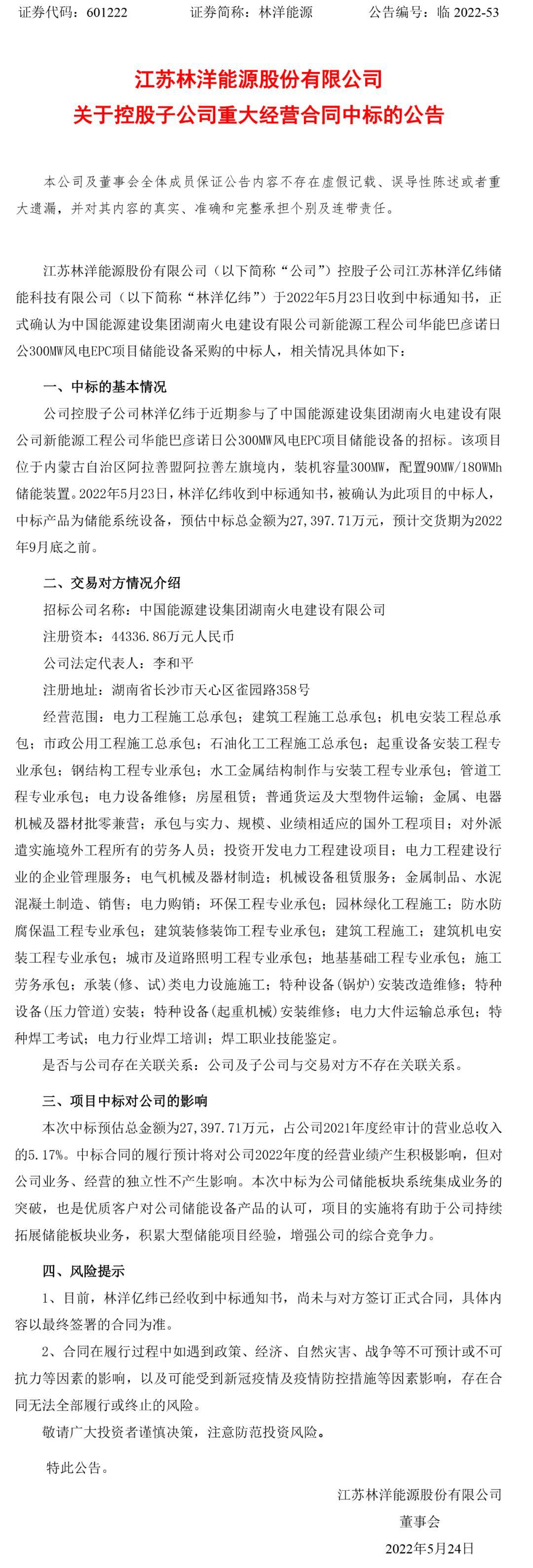 5月23日晚間,林洋能源(601222)(601222.SH)發(fā)布公告,公司控股子公司江蘇林洋億緯儲能科技有限公司正式中標中國能源建設集團湖南火電建設有限公司新能源工程公司華能巴彥諾日公300MW風電EPC項目儲能設備采購,預估中標總金額為2.74億元。