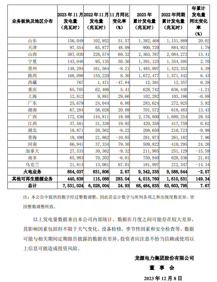 12月8日,龍?jiān)措娏Πl(fā)布2023年11月發(fā)電量數(shù)據(jù)公告。