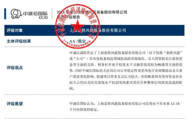 中誠(chéng)信,作為業(yè)內(nèi)公認(rèn)的頂級(jí)信用評(píng)級(jí)機(jī)構(gòu),其評(píng)級(jí)體系嚴(yán)謹(jǐn)而公正。泰勝風(fēng)能憑借在風(fēng)電裝備制造市場(chǎng)的龍頭地位、生產(chǎn)基地的戰(zhàn)略性布局及碼頭資源的獨(dú)特優(yōu)勢(shì),贏得了中誠(chéng)信的高度贊譽(yù)。公司穩(wěn)健的利潤(rùn)增長(zhǎng)、科學(xué)的財(cái)務(wù)結(jié)構(gòu)、雄厚的資本實(shí)力以及清晰而廣闊的發(fā)展藍(lán)圖,共同構(gòu)筑了“AA+”評(píng)級(jí)的堅(jiān)實(shí)基石。