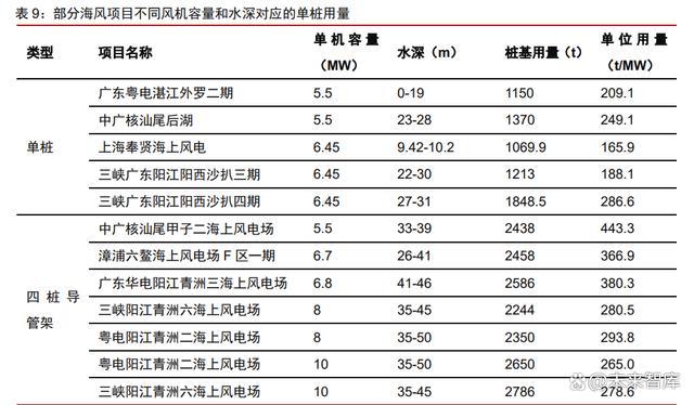 風(fēng)電大型化和深?;苿訕痘⑺矄螜C(jī)用量增長。據(jù)海力風(fēng)電招股書,適用于 0- 24m 水深單機(jī)容量 4MW 的單樁基礎(chǔ)重量在每臺 550-1000 噸之間;水深 30m 以上單機(jī) 容量 5MW 使用的四樁導(dǎo)管架基礎(chǔ)重量為 243 噸。以三峽陽江沙扒三期和三峽陽江青洲六 項(xiàng)目對比測算樁基塔筒單機(jī)用量,陽江沙扒三期安裝單機(jī)容量 6.45MW 風(fēng)機(jī) 62 臺,陽江 青洲六分別安裝 8MW 和 10MW 容量風(fēng)機(jī) 25 和 80 臺,風(fēng)機(jī)葉片直徑、輪轂高度數(shù)值均增 大,單臺塔筒和樁基用量為 734 噸和 2657 噸,較淺水域小容量風(fēng)機(jī)項(xiàng)目對應(yīng)的 380 噸和 1693 噸用量提升。