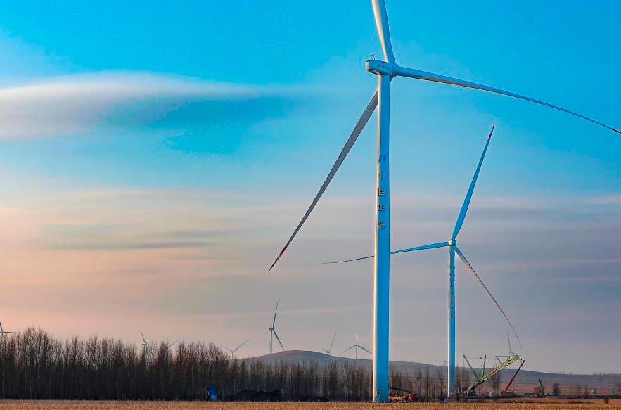 2022年12月27日,施工人員在華能突泉30萬(wàn)千瓦風(fēng)電項(xiàng)目建設(shè)現(xiàn)場(chǎng)吊裝最后一臺(tái)風(fēng)電組件。
