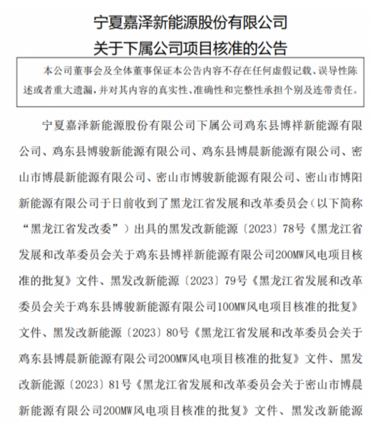 公告披露,寧夏嘉澤新能源股份有限公司下屬公司于日前收到了黑龍江省發(fā)展和改革委員會(以下簡稱“黑龍江省發(fā)改委”)出具的風(fēng)電項(xiàng)目核準(zhǔn)的批復(fù)文件,共計六個風(fēng)電項(xiàng)目獲得核準(zhǔn),總裝機(jī)容量為1100MW。