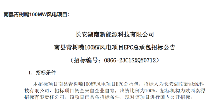 公告顯示,南縣青樹嘴風(fēng)電場項目總?cè)萘?00MW,年等效滿負荷利用小時不低于1815小時。安裝16臺單機容量不低于6.25MW的風(fēng)力發(fā)電機組,輪轂高度不低于160m,采用混塔方式,葉輪直徑不低于191m。