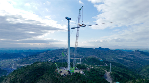 三都縣位于貴州省黔南州東南部,地處“月亮山、雷公山”腹地,境內(nèi)以山地為主,風(fēng)力資源豐富,點(diǎn)多面廣,電網(wǎng)接入條件優(yōu)良,消納能力強(qiáng),新能源風(fēng)電項(xiàng)目建設(shè)前景廣闊。11月24日,三都縣風(fēng)電場(chǎng)項(xiàng)目之一的周覃風(fēng)電場(chǎng),兩臺(tái)高120多米的風(fēng)力發(fā)電機(jī)屹立在山頂上,工人們正在對(duì)塔上設(shè)備開展偏航、安全鏈、控制等調(diào)試工作。
