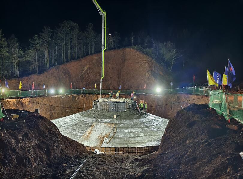 首臺(tái)風(fēng)機(jī)基礎(chǔ)澆筑在風(fēng)電項(xiàng)目施工中具有里程碑的意義,直接影響后續(xù)吊裝及發(fā)電目標(biāo)。為確保澆筑工作安全順利完成,針對(duì)四號(hào)機(jī)位運(yùn)輸?shù)缆窂?fù)雜、天氣雨多霧大的實(shí)際情況,項(xiàng)目部召開專題部署會(huì),合理安排人員及保障設(shè)備,細(xì)化任務(wù)分工到個(gè)人,編制專項(xiàng)措施,有力保障混凝土順利澆筑。全體施工人員充分發(fā)揚(yáng)鐵軍精神,克服天氣及夜間施工等不利因素,經(jīng)過18個(gè)半小時(shí)的晝夜奮戰(zhàn),順利完成首基澆筑,得到業(yè)主和監(jiān)理的一致肯定。