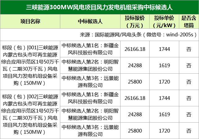 三峽能源內(nèi)蒙古包頭市可再生能源綜合應(yīng)用示范區(qū)1號50萬千瓦(二期30萬千瓦)風(fēng)電項(xiàng)目分為兩個(gè)標(biāo)段,標(biāo)段一和標(biāo)段二中標(biāo)候選人分別為金風(fēng)科技、明陽智能、遠(yuǎn)景能源。